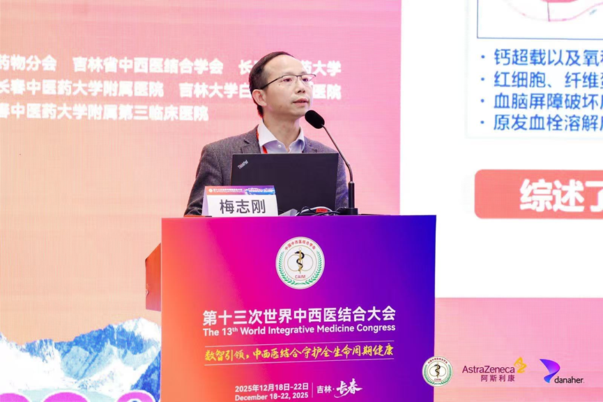 由中国中西医结合学会主办的第十三次世界中西医结合大会于2025年12月18日至22日在吉林长春召开。本次大会以“数智引领,中西医结合守护全生命周期健康”为主题,汇聚了来自中国、俄罗斯、英国、比利时等多个国内外专家学者,大会设立主会场及临床医学、药学、交叉学科、青年、吉林特色等5个专场,并同期举办第三届白求恩医学前沿创新论坛及肾脏疾病等13个分会场,会议期间,共进行了270余场学术报告与交流。湖南中医药大学中医药科学院梅志刚教授受陈香美院士邀请参加此次会议,并在青年专场上作了题为《守正创新,数智赋能:缺血性脑病中西医结合防治新策略与进展》的学术报告。